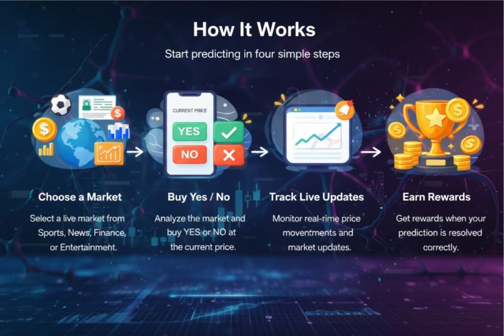 - Explore Live Prediction Markets built around real-world events, trends, and outcomes across multiple categories.